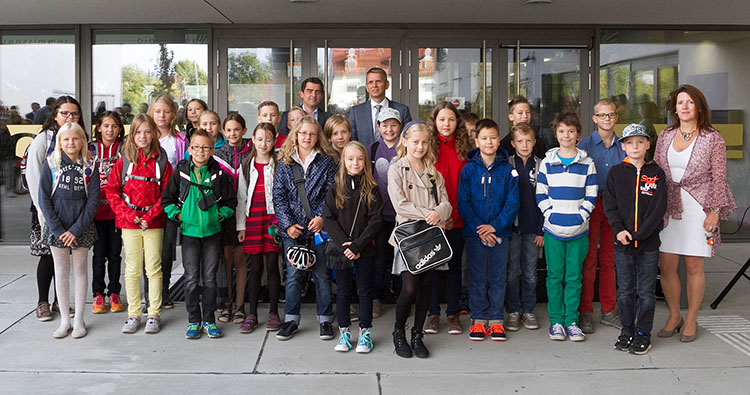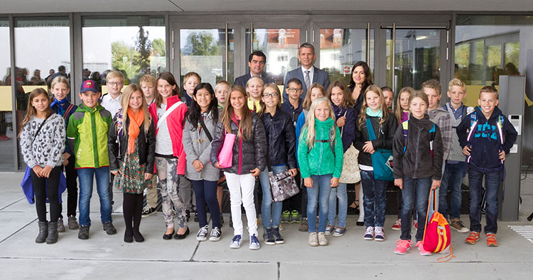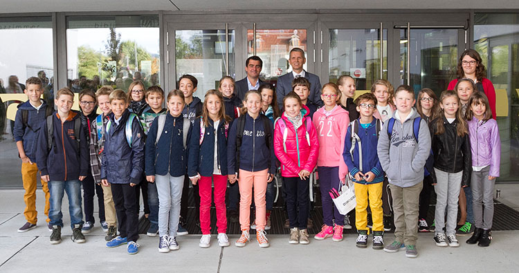 Schülerinnen und Schüler der ersten Klassen mit Klassenvorstand, Direktor und Bürgermeister